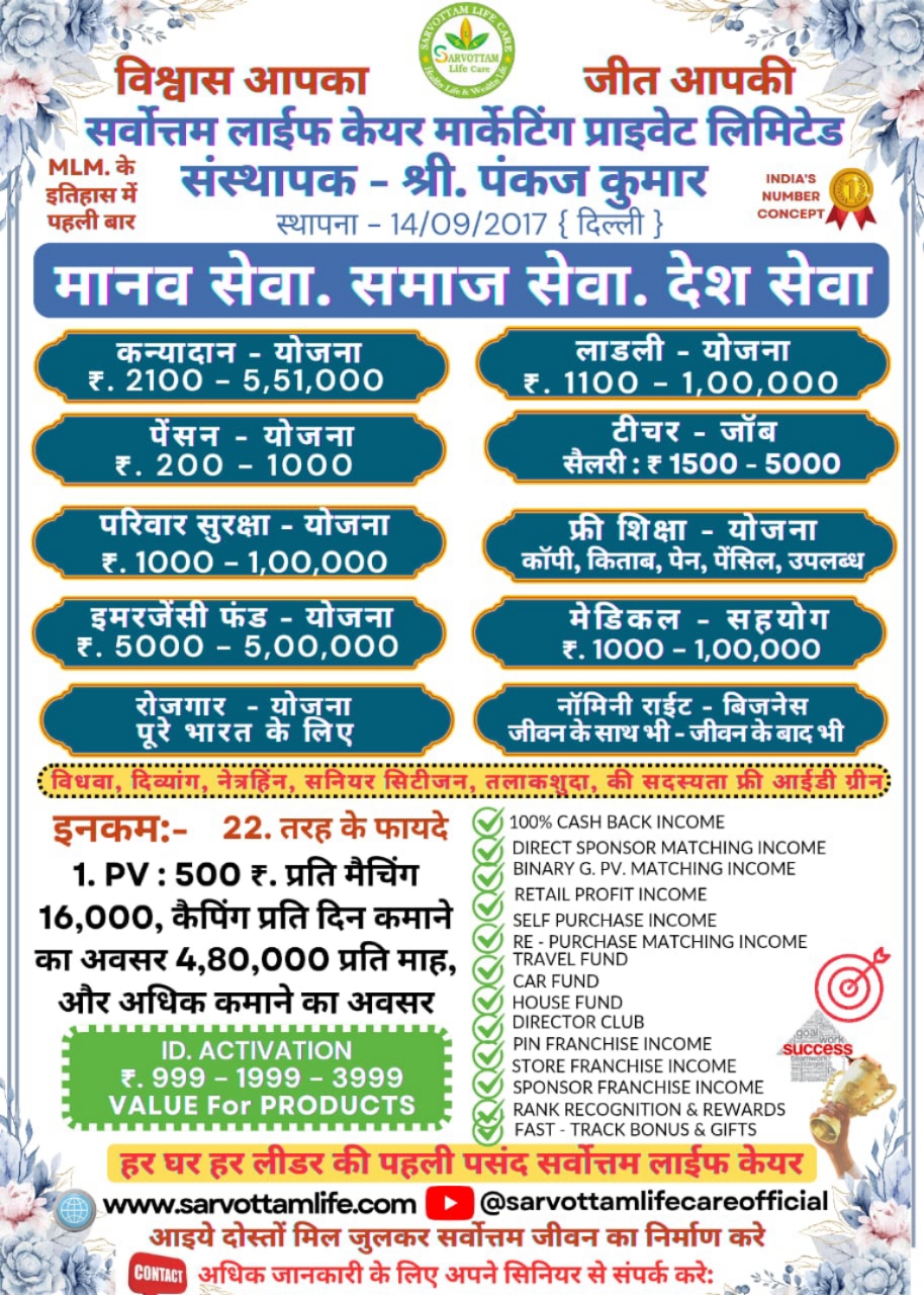SARVOTTAM LIFE CARE MARKETING is one type of MLM. Most commonly, the salespeople are expected to sell products directly to consumers by means of relationship referrals and word of mouth marketing. MLM salespeople not only sell the company's products but also encourage others to join the company as a distributo.